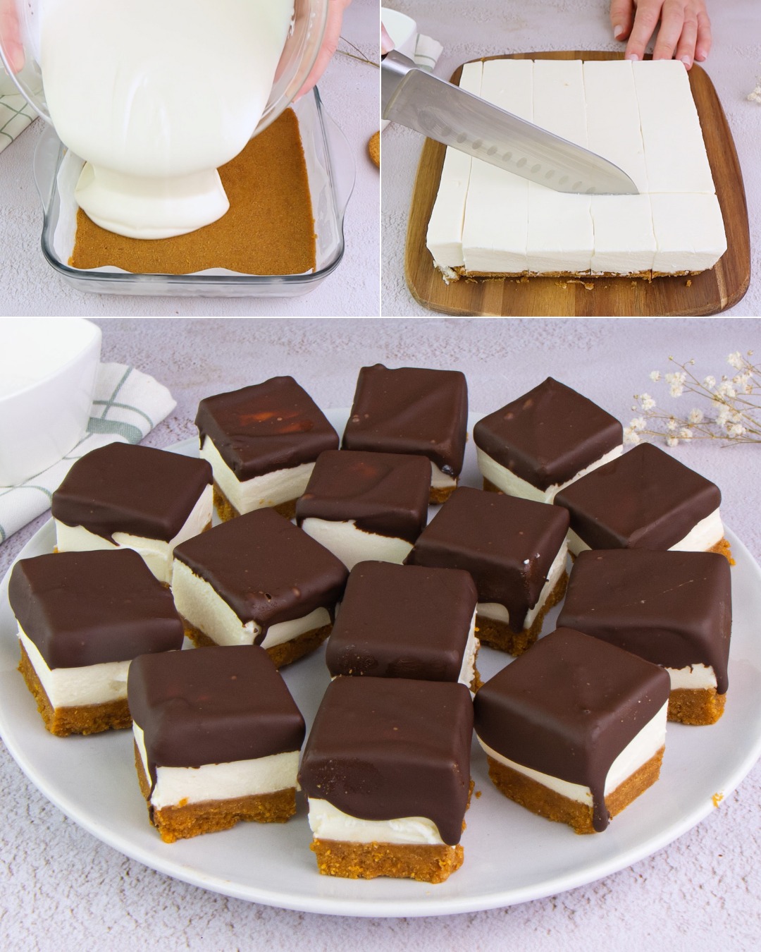 Extienda la mezcla en moldes pequeños para muffins o en una fuente para hornear, presionando el fondo firmemente para crear una base firme. Refrigere durante unos 15-20 minutos para que se solidifique.
